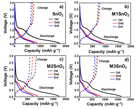 Galvanostatic charge–discharge profiles of (a) SnO2 NS and (b–d) M1/M2/M3SnO2 anodes for the initial three cycles.