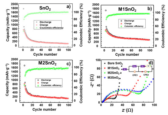 Cyclic performances and Nyquist plots of (a) SnO2 NPs and (b–d) M1/M2/M3SnO2 anodes.