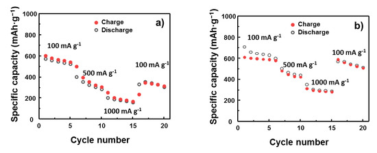 The rate cycling performance of the bare SnO2 and M1SnO2 electrodes was also investigated, as shown in Figure 8. Performance was recorded for 20 cycles each at charge rates of 100, 500, and 1000 mA·g−1 before the charge rate returning to 100 mA·g−1. The SnO2 electrode shows greater degradation in specific capacity retention when the scan rate is increased. The retentions after 5 cycles at 500 and 1000 mA·g−1 were 47% and 26%, respectively. In contrast, the M1SnO2 electrode shows a smaller decrease in specific capacity retention compared to that of pure SnO2, where the retentions at 500 and 1000 mA·g−1 were 70% and 47%, respectively, thus demonstrating much better rate performance than the SnO2 electrode did. The restoration of the M1SnO2 electrode when the current rate was decreased from 1000 to 100 mA·g−1 was also remarkable, corresponding to 95%, far exceeding that (55%) of the SnO2 electrode. These results suggest that the introduction of a single MoS2 layer on SnO2 electrodes could further enhance the electrochemical performance.