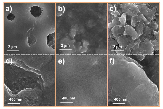 To further confirm the effect of the MoS2 layer, the surface of the electrode was characterized by ex situ SEM, as shown in Figure 9. The assembled half-cells were run for 10 cycles, and then they were disassembled, washed carefully with dimethyl carbonate and acetone, and dried. Figure 9a,d clearly show that the bare SnO2 electrode was easily broken, creating micro-holes on the surface. However, the M1SnO2 electrode was protected from washing, as illustrated in Figure 9b,e. This indicates that the MoS2 layer can facilitate the formation of a stable and smooth SEI layer. In Figure 9c,f, the M3SnO2 electrode after 10 cycles shows a thick MoS2 surface that is much rougher than that of the M1SnO2 surface. This would be due to the restacking of the MoS2 NS into a bulky multilayer state. Based on the results, a thin MoS2 coating layer acted as a protecting layer and formed a uniform SEI layer. The multiple MoS2 NS layers generated thick and rough surfaces, leading to inferior electrochemical performance for lithium-ion storage.
