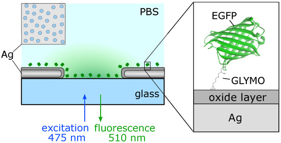 The protein binding step was carried out right before the fluorescence studies. The covalent binding of EGFP was achieved via the reaction of the GLYMO epoxy groups with one of the protein’s surface amine groups. For each sample, a 20 L droplet of 0.25 M EGFP solution in phosphate buffered saline (PBS) at pH = 7.4 was placed on top of the GLYMO-modified surface and covered by a microscope slide to prevent water evaporation. After 20 min, the top cover slide was removed and the sample was rinsed by PBS to remove unbound protein molecules. Then, a cover slide was placed on top of the surface with immobilized EGFP molecules with a small amount of the PBS buffer, and the fluorescence measurements were performed. Control samples with EGFP immobilized on bare glass were produced by the same procedure.
