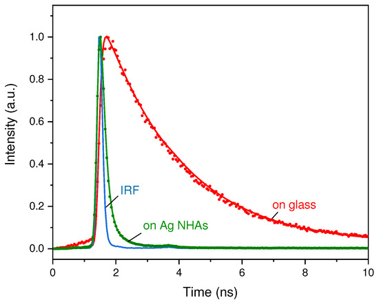 To get insight into the origin of the EGFP fluorescence enhancement on AgNHAs, we also study the excited-state decay kinetics. The fluorescence lifetime is found to be strongly affected by the presence of NHAs. The normalized fluorescence decay curves obtained for EGFP immobilized on glass and AgNHAs are presented in Figure 3 together with the corresponding fits and the instrument response function (IRF). The fluorescence of EGFP on glass demonstrates a single-exponential decay with a lifetime of ns, which is the same as in the solution. For the AgNHA-bound EGFP, the decay kinetics becomes two-exponential. The first and the fastest component has a characteristic lifetime of ns with a fraction of . The second component has a lifetime of ns.