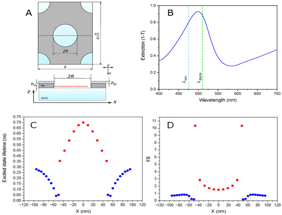 Simulation of the EGFP fluorescence enhancement near periodic 100 nm AgNHA. (A) Top and section views of the simulated periodic box; the blue and red dots indicate the positions of a dipole source during the scan (the same color code is used in panels B,C) Extinction (1-T) spectrum of Ag NHA (blue line). The excitation and oscillating dipole emission wavelengths are shown by the blue and green dashed lines, respectively. (C) Excited state lifetime. (D) Fluorescence enhancement factor.