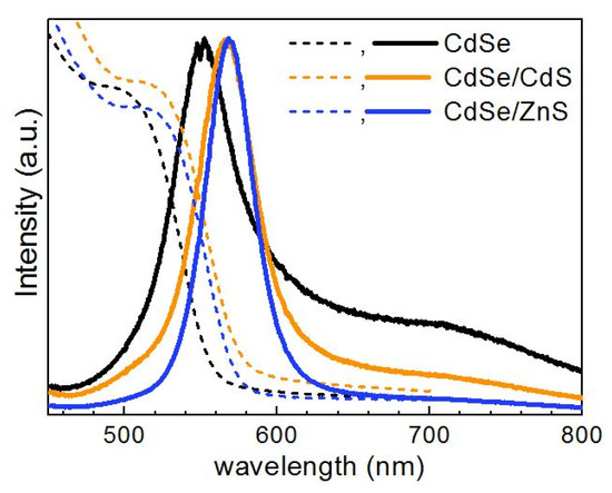 Representative optical absorption (dashed lines) and photoluminescence (PL) (solid lines, λexc = 325 nm) of a series of about 3nm CdSe NCs and 4 nm core/shell NCs in gelatin matrix.