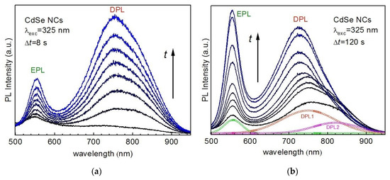 Evolution (from black to blue) of the room-temperature PL spectra (λexc = 325 nm, 0.1 W/cm2) of CdSe NCs in a gelatin matrix at different time-scales, with the periods between the spectra equal to 8 s (a) and 120 s (b). EPL and DPL denotes, respectively, the excitonic emission band and the trap/defect-related band. A representative deconvolution of the latter into two components, DPL1 and DPL2, is shown for the bottom spectrum in (b).