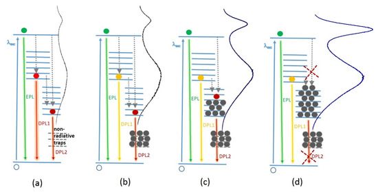 From the unchanged position of the EPL band, we can conclude that no noticeable photooxidation (photocorrosion) takes place the under given illumination conditions. This is different from numerous previous results on II-VI NCs in solutions or polymers [23,32,33,34,35], which revealed a blue shift of the optical spectra, indicative of the NC size reduction during exposure to light. Notably, along with restoring the EPL/DPL ratio at longer exposure times, the DPL bands show a blue shift and narrowing, which can be understood as a result of intensity redistribution between the longer- (DPL2) and shorter-wavelength (DPL1) components of the DPL band. We note, that the interpretation of the broad and often asymmetric DPL band of II-VI and other NCs as a superposition of two or more PL components related with different recombination routes was also proposed in other studies [13,48,49]. The spectral behavior of the apparently complex DPL band in Figure 2b could be explained by assuming an elimination of defects or other trap states mediating the DPL2 recombination, as a result of photoannealing or photocorrosion. However, this is excluded in our case because of the unaffected EPL peak position and FWHM. Therefore, we suggest an alternative explanation that assumes filling of gap states mediating DPL2 with electrons during prolonged illumination with laser light. The saturation of the gap states precludes radiative transition of photoexcited electrons into (or from) these states, as schematically shown in Figure 3. For the model to explain the initial enhancement of the PL spectrum as a whole (i.e., both EPL and DPL), we assume that neutralization of non-radiative traps occurs during illumination by filling them with photoexcited charge carriers (Figure 3a,b). Subsequent filling of the radiative traps is supposed to cause blue shift and narrowing of the entire DPL band due to suppression of the DPL2 component (Figure 3c,d).