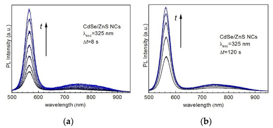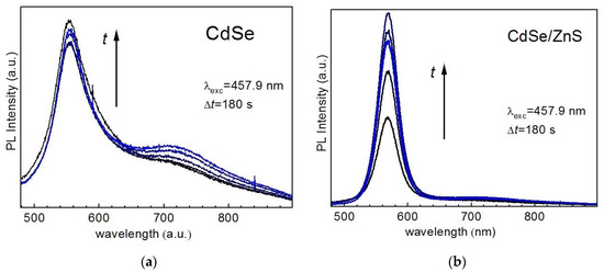A vital aspect of the luminescent properties of NCs is the predictable behavior of the PL emission with time [19]. Most applications demand stability of the PL intensity, peak position, and spectral line shape. Robust NCs are required for LEDs, lasing, and optical imaging. At the same time, numerous other potential NC applications rely on a variation of the PL intensity or shift of the PL maximum (color change) in response to certain stimuli [20]. For instance, brightening or quenching of the PL emission is the basics of optical readout of chemical sensors [21] and (nano)thermometers [22]. Therefore, the investigation of the temporal behavior of the PL spectra of QDs, in particular in application-relevant environments, such as water solutions or polymer matrices, is vitally important. There are studies of the PL spectra of colloidal II-VI NCs under a prolonged illumination in solutions [23,24,25,26,27,28], dried on substrates [29,30,31], and embedded in polymers [23,24,32,33,34,35]. The studies revealed a puzzling variety of trends in intensity and spectral changes, indicating multifaceted physical and chemical processes underlying the apparent PL photoenhancement, which differ significantly between particular studies. In most cases, the photoenhancement was studied for NCs possessing only excitonic PL band and was accompanied by a blue-shift of the PL band [23,34], indicative of photocorrosion of the NC (surface).