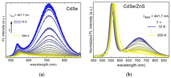 The investigation of the temperature dependence of the shape and intensity of PL bands is a very informative tool of obtaining information about the (re)distribution of charge carriers over the energy levels in bulk and NC semiconductors. In particular, a different evolution of the PL spectra of bare CdSe (Figure 7a) and core/shell CdSe/ZnS NCs (Figure 7b) with temperature provides additional arguments in support of the PL photoenhancement mechanism proposed and discussed above. Besides the common blue shift and narrowing of EPL, inherent to PL recombination from band states of a crystalline semiconductor, a different evolution of EPL/DPL intensity ratio is observed for the two types of NCs. Bare CdSe NCs reveal a much stronger relative enhancement of the DPL band than core/shell NCs (Figure 7). This trend can be well understood in view of a larger concentration of radiative traps on the surface of bare CdSe NCs.