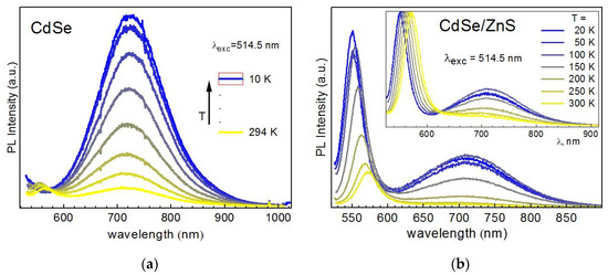 Qualitatively, the same trend was found in temperature dependence obtained with λexc = 514.5 nm (Figure 8), confirming the general nature of the phenomenon observed. One distinct feature is though observed at λexc = 514.5 nm for CdSe NCs. In particular, the EPL band gradually disappears from the spectrum at certain temperatures (Figure 8a). This fact is rather straightforward to understand—when the energy of the bandgap becomes larger than the energy of the excitation quanta, the interband excitation of electrons is not possible anymore. Surprisingly, this situation does not affect the DPL band—its intensity continues to grow steadily even after the disappearance of the EPL band (Figure 8a). This experimental observation is very important for understanding the electronic processes behind the optical properties of NCs. In particular, it indicates that the “supply” of the charge carriers to the electronic states responsible for DPL emission does not necessarily involve the step of interband excitation/absorption but may apparently occur “directly” (via direct subbandgap photoexcitation). In view of the rather high intensity of the DPL emission, this transfer of photoexcited charges or energy to DPL emitting states must be very efficient. A relevant model involved for explaining such high efficiency can be the self-trapped exciton (STE) model proposed recently for the interpretation of highly efficient broad-band PL of ultrasmall II-VI [13,47] and I-III-VI [10,47] colloidal NCs. This model assumes a strong electron-optical phonon coupling (EPC) of the photoexcited charges in very small NCs and provides also a reasonable explanation for an anomalous temperature dependence of their broad-band PL spectra [47].