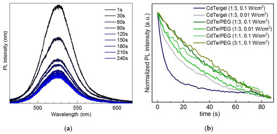 For CdTe NCs synthesized using thioglycolic acid (TGA) as a stabilizer and subsequently introduced into a polymer, we observed a noticeable degradation of the PL intensity (Figure 10) that occurred on the same timescale and excitation power as the photoenhancement was observed above for polymer-stabilized CdSe and core/shell NCs (see Section 3.1, Figure 2 and Figure 4). Even though there was a trend toward saturation of the PL intensity at longer time scales (hundreds of seconds to tens of minutes), which was inversely proportional to the excitation power (Figure 10b), no indication of subsequent intensity enhancement was observed. In Figure 10 the results are presented for gelatin and polyethylene glycol (PEG), but qualitatively similar results were obtained for PVA and polyvinyl pyrrolidone (PVP). Nevertheless, no severe structural degradation can be concluded as evidenced by the constant position of the EPL peak (DPL was not observed for this sort of NCs). This is an important implication of the polymer matrices especially for CdTe NCs, because compared to its sulfide and selenide counterparts telluride compounds are generally more sensitive to photodegradation [58], but even a gelatin matrix ensures sufficient protection of the NCs against photooxidation. For instance, strong spectral changes were observed in both optical absorption and PL of aqueous CdTe NC solutions under prolonged illumination even with the UV-component of sun irradiation [59].