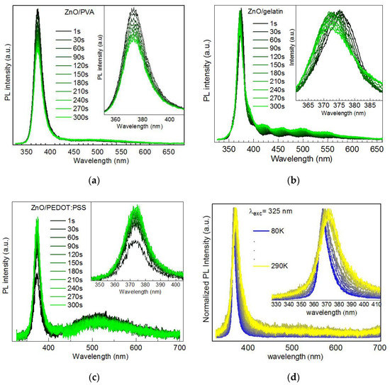 A distinct behavior was observed for ZnO NCs synthesized ex situ using no additional stabilizers except zinc acetate that served as a source of zinc in the synthesis and tetraethyl ammonium. This was the only type of NCs that revealed qualitatively different behavior in different polymers, and different from the other NCs. In particular, for ZnO NCs embedded into a PVA matrix, a slight decrease of the PL intensity with illumination time was observed (Figure 11a). When embedded into a gelatin matrix, the EPL band revealed a noticeable blue shift at a rather unchanged PL intensity (Figure 11b). When using conductive poly(3,4-ethylenedioxythiophene) polystyrene sulfonate (PEDOT:PSS), a certain enhancement of the PL intensity was observed at very early time of illumination, followed by a quick saturation of the PL intensity, with no measurable shift of the PL peak position (Figure 11c).
