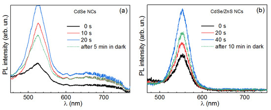 The determinant role of the surface and stabilizing agent in the PL properties of colloidal NCs is generally known [50]. For NCs synthesized using polymers as stabilizers, with subsequent transfer of NCs into polymer matrix by simple evaporation of the solvent (water in our case), the type of polymer is expected to have an effect not only on the PL spectrum and quantum yield but also on the PL behavior under illumination. Indeed, CdSe NCs synthesized in a polyvinyl alcohol (PVA) matrix (Figure 5b) reveal a weaker photoenhancement compared to that of the CdSe-gel NCs analyzed above. A possible reason for that can be the relatively higher oxygen permeability of PVA films, with oxygen being an efficient scavenger of (photoexcited) electrons [4]. Additionally, recent detailed studies of similarly synthesized CdS/PVA NCs assumed an important role of the electronic trap states in the polymer in the PL properties of the NC [15,52,53,54].
