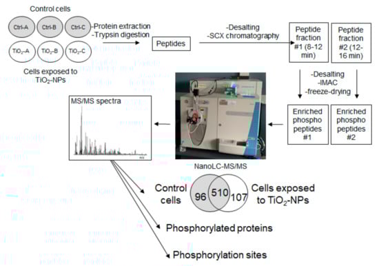 Phosphoproteomes of control cells and cells exposed to TiO2-NPs were analyzed after enrichment by high-resolution tandem mass spectrometry [37]. As shown in Figure 1, phosphopeptides in both non-exposed and exposed cells were enriched for each of the three biological replicates, resulting in two separate fractions (#1 and #2) per sample. These two samples were analyzed separately over a 90-min gradient by nanoLC-MS/MS with a high-resolution mass spectrometer, and the results were merged (Supplementary Table S1).