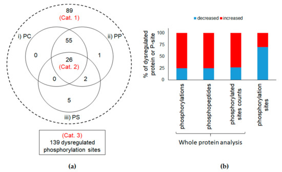 Comparison of different phosphorylation levels. (a) Distribution of the number of proteins included in the different study groups. Whole-protein analysis groups (Cat. 1 and 2) and phosphorylation sites (Cat. 3); (b) Distribution of up- (red) or down-regulated (blue) (fold-change ≥ 1.5, p-value < 0.05) phosphorylation levels in terms of whole protein indicators (phosphorylation, phosphopeptide and phosphorylated site counts) or phosphorylation level.