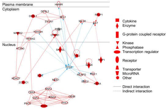 Our analysis highlights the central role of TP53 in these processes, as illustrated by a network identified using IPA (Figure 3). This network focuses on cellular assembly and organization, DNA replication, recombination and repair, and cancer pathways. The phosphorylation of TP53 itself is not shown to be affected, but p53 acts as an upstream transcriptional regulator of several proteins having modulated phosphorylation levels (SKIV2L, TPX2, BAG6, SON, KIF4A, POP1, RPLP1, DERL1, MARK2, ZC3HC1, PHC3). We previously showed that repeated exposure of A549 cells to the same TiO2-NPs as in the present study, up to two months, leads to increased phosphorylation and acetylation of TP53 [49]. This suggests that the TP53 pathway is activated in A549 cells exposed to these TiO2-NPs. Induction of DNA damage and/or apoptosis is known to be related to activation of the TP53 pathway [64,65,66,67,68,69], we show here that these cellular processes are at least partly impacted via dysregulated phosphorylation.