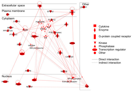 Several pathways identified by David-based analysis are related to disturbance of the cytoskeleton, both actin cytoskeleton and microtubules (“Cytoskeleton” FDR 0.05%, “actin cytoskeleton” FDR 0.52%, “actin binding” FDR 2.89%, “microtubule cytoskeleton organization” FDR 6.27%, etc.). Some of these proteins play roles in cell migration, motility, and adhesion. For instance, TLN2 is a component of focal adhesion plates and is involved in cell adhesion in synapses, ZYX is a stabilizer of focal adhesions in muscle cells and synapses [70], and CTTN is involved in cell migration and the formation of metastases [71]. Other proteins rather play roles in cellular structure, such as MAP1B, which is involved in microtubule polymerization and stabilization, in the formation of autophagosomes and in membrane blebbing [72]. Likewise, MPRIP stabilizes actin fibers and plays a role in development of stress fibers [73] and KIF4A is necessary for successful cytokinesis [74]. Moreover, some of these proteins are involved in intracellular trafficking, such as NDRG1, which is involved in trafficking of vesicles and lipids and CTTN, which is involved in protein trafficking and in endocytosis [75]. This impact on the cytoskeleton is illustrated by a second network identified using IPA, which involves 35 proteins and illustrates the impact of TiO2-NPs on cellular development, movement and morphology (Figure 4).