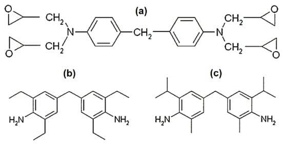 Chemical structure of (a) tetraglycidyl methylene dianiline, (b) 4,4′-methylenebis(2,6-diethylaniline), and (c) 4,4′-methylenebis(2-isopropyl-6-methylaniline) [16].
