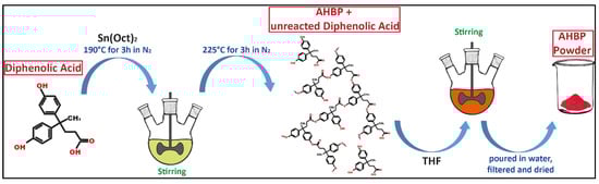 AHBP synthesis was performed according to a modified procedure reported in literature [30]. Diphenolic acid (5.0 g) and Sn(Oct)2 (60 μL) were magnetic stirred in a three-necked round-bottom flask at 190 °C under nitrogen atmosphere for 3 h, to ensure the homogeneity of the mixture. Then, the temperature was raised up to 225 °C to trigger the polymerization and the reaction was kept stirring for 3 h. The crude product was dissolved in 10 mL of THF, and then the solution was poured in a large amount of deionized water (≈0.5 L) in order to precipitate the AHBP. Subsequently, the precipitate was filtered, washed with deionized water, and then dried in an oven under vacuum at 100 °C, for a night. The obtained AHBP was characterized by a red/brown color. Figure 2 shows a schematization of the synthesis procedure.