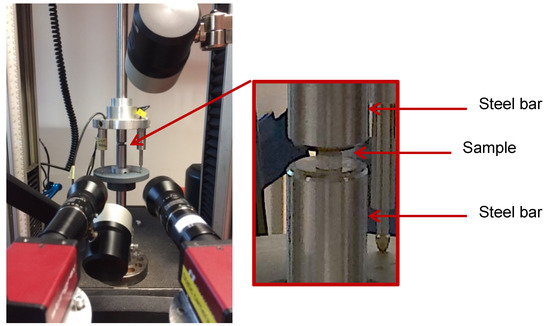 Next to the dynamic compression tests, quasi-static reference tests were performed on an Instron 5569 universal testing machine (see Figure 4) with a load cell of 50 kN. In the tests, the same sample geometry and boundary conditions were used as for the dynamic tests. A lubricant was also applied to the sample/bar interfaces to reduce friction. Both the DIC technique and displacement transducers were used to measure the deformation of the samples. Three different quasi-static testing speeds of 0.2, 2, and 20 mm/min were imposed to the sample. For both reference quasi-static and high strain rate compression tests, the recorded DIC images were processed using the commercial digital image correlation software MatchID to obtain the local strains after testing. The engineering and true DIC strains were calculated from the developed full displacement field as average strain in an area of approximately 3.5 × 3.5 mm2 on the surface of the sample, following the reference Biot and Hencky strain measures, respectively.
