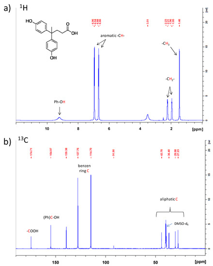 The 1H-NMR spectrum of diphenolic acid is shown in Figure 5a. The three upfield signals (δ = 1.46, 1.96, and 2.22) are attributable to CH3– and –CH2– of the aliphatic chain, respectively. The peaks observed at δ = 6.95 and 6.67 are associated with aromatic protons on phenolic rings. Then, at δ = 9.15 a broad, though weak, peak appears, which is attributable to phenolic hydroxyl. Similarly, the 13C-NMR spectrum (Figure 5b) shows signals included in the δ = 114–139 range associated with aromatic carbon atoms, and peaks in the δ = 27–45 range related to the aliphatic carbon atoms. The phenolic carbon is indicated by the peak at δ = 154.97, while the carboxylic carbon is clearly identified by signal at δ = 174.71.