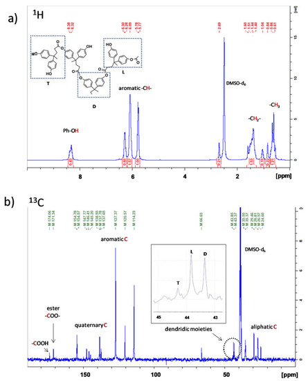 In the 13C-NMR spectrum (Figure 6b), no remarkable peaks shifts are observed compared to diphenolic acid. Although, a new peak associated with the ester group appears at δ = 171.34, indicating the polymerization that occurred. Since not all carboxyl groups take part in the esterification reaction, their peaks (δ = 174.06) are still present in the spectrum. Branched unities (T, L, and D) are identified by three signals within the 43–45 of δ-range, whose magnification is reported on the spectrum. Based on these assignments, DB calculated from Equation (3), was 0.57 according to common values for hyperbranched polymers (less than 1) compared to DB (equal to 1) for dendrimers [33].