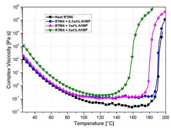 At higher contents, AHBP induces an increase of system viscosity, and this effect is more pronounced in correspondence with the temperatures associated with the minimum viscosity of the hosting matrix (≈120 °C). In particular, the viscosity at 120 °C for the neat resin is about 30 mPa·s, but the addition of 5 wt% of AHBP raises it up to 200 mPa·s, that is about one order of magnitude greater.