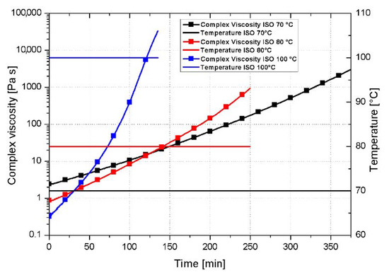 Figure 10 reports the isothermal curves (70, 80, and 100 °C) relative to the system loaded with 5 wt% of AHBP, which reveals the highest value of minimum complex viscosity (≈200 mPa·s at 120 °C). Isothermal rheometric tests at 120 °C are not reported as starting from this temperature the polymerization reaction is almost instantaneously triggered. Obtained viscosity profiles indicate that the system infusion time reduces sharply by increasing the temperature thus limiting the processing time at 100 °C for 25 min, which correspond to the time required to reach 1.0 Pa·s viscosity.
