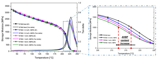 As it is evident by Figure 11, low AHBP contents (i.e., 0.1 and 1 wt%) induce a negligible change in Tg, whereas a higher filler content (i.e., 5 wt%), provides a reduction in Tg (Tg = −12 °C), i.e., from 225 °C for neat RTM6 to 212 °C for the 5 wt% filled samples. The same trend, but with a lower variation, is computed by analyzing the DMA scans and corresponding Tg values with an overall change of ≈4 °C for the same systems. In the case of DSC tests, whose main assumption is point-like sample, this reduction is reasonably related to the addition of AHBP phase characterized by its lower Tg (≈95 °C), which inevitably will reduce the final system Tg.