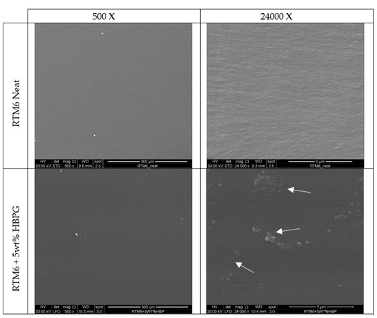 The mechanism associated with the improvement of the fracture toughness behavior is clearly observable in the SEM images of the fracture surfaces presented in Figure 15. As a matter of fact, the addition of AHBP up to 5 wt% potentially induces plastic deformation of the hosting matrix under a severe deformation state (white arrows in Figure 15). According to this feature, the AHBP/RTM6 system could absorb more energy when cracks occur, justifying the larger increase of critical released energy in forming new surfaces compared to the neat matrix, as shown in Figure 14.