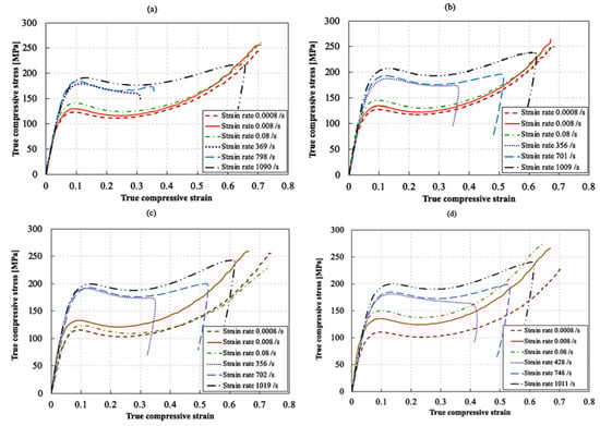 The true strains obtained from the displacement transducers were in excellent agreement with the strains directly obtained from the DIC up to a strain value of 0.2. Similarly, the strains obtained from the Hopkinson analysis (based on the strain measurements on the bars) also showed excellent agreement with the DIC strains up to 0.2. Moreover, it should be noted that the speckle pattern could not follow the deformation of the samples beyond 0.2 strain in both quasi-static and high strain rate tests. Consequently, the strains higher than 0.2 were based on that obtained from the Hopkinson analysis (for the high strain rate tests) and from the displacement transducers (for the quasi-static tests). The strain showed an initial increase up to a strain level of 0.06, followed by a slight reduction and a relatively constant strain in the range 0.06–0.15. This range was used to calculate the strain rates reported in Figure 16. The strain rates obtained from the tests were in the range of 0.0008–0.08 s−1 for the quasi-static tests, and 350–1100 s−1 for the high strain rate tests.