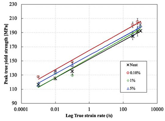 Effect of strain rate on the peak true yield strength neat epoxy resin and different weight content of hyperbranched polymers (HBPs).