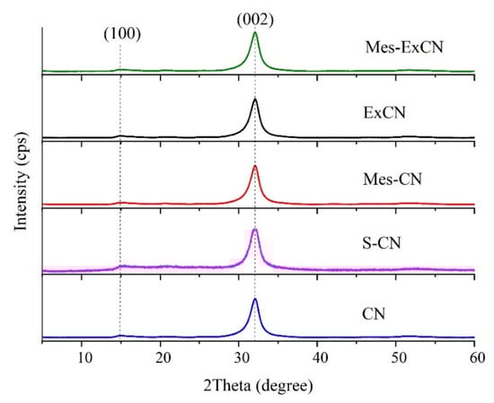 Figure 1 demonstrates that S-CN was the most-light absorbing sample and the absorption decreased in the sequence of S-CN > Mes-CN ˃ Mes-ExCN > CN > ExCN, which agrees with the nanomaterial colors displayed in Figure S3. The higher absorption of S-CN in comparison with CN was also referred to in the literature, for example, in the works of [,,,]. The derivatization of CN with mesyl chloride was supposed to incorporate new atom groups to heptazine units acting as chromophores. The resulting derivatized CN structures were discussed below based on other experimental results.