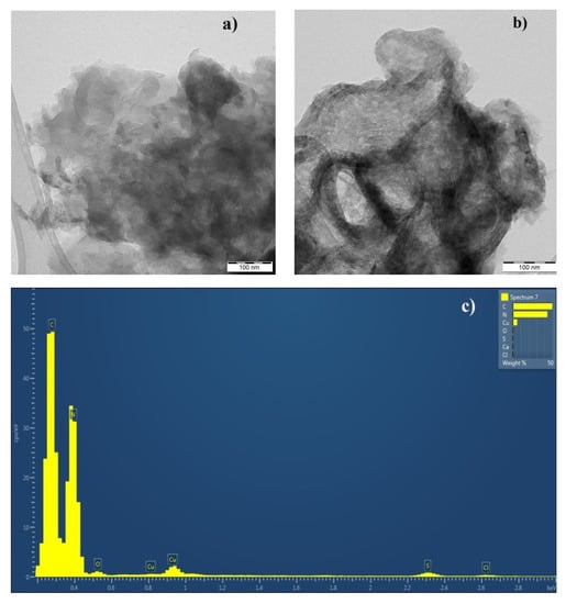 Transmission electron microscopy (TEM) micrographs of Mes-CN (a), Mes-ExCN (b), and EDX spectrum of Mes-ExCN (c).