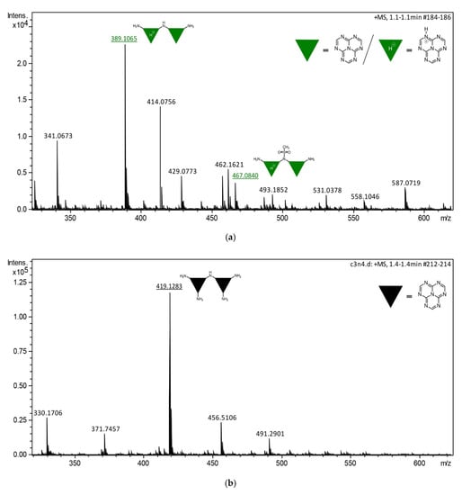 High resolution mass spectra were obtained by means of a MicrOtofIII spectrometer (Bruker Daltonik, Bremen, Germany) with Atmospheric pressure chemical ionization (APCI) ionization in a positive mode. Before the measurement, the samples were wetted with methanol and delivered into an APCI source in the solid state using a direct glass capillary inlet. The setting of the ion source was as follows: capillary—4000 V, end plate—500 V, corona—3000 nA, nebulizer (N2)—1 Bar, dry gas (N2)—4 L/min, temperature—drying 350 °C, and vaporizer—400 °C. The HRMS spectra were taken in the m/z range of 50 to 1550 Da with the low mass of 50 m/z and collision RF of 400 Vpp. The spectra were processed using the Compass Data Analysis 1.5 software (Bruker Daltonik, Bremen, Germany). The accurate mass scale was calibrated using ESI-L Low Conc. Tuning Mix (Agilent technologies, Santa Clara, CA, USA).