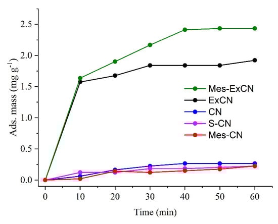 The adsorption of AO7 on the nanomaterials was investigated under the same laboratory conditions, but in the dark. The adsorption plots depending on time are shown in Figure 9. Table 3 also summarizes the adsorbed mass of AO7 after 60 min. The adsorption equilibria for all adsorbents were reached during 40 min. The highest adsorbed mass of AO7 was observed for Mes-ExCN and ExCN; Mes-ExCN adsorbed more than ExCN. On the other hand, CN, S-CN, and Mes-CN adsorbed similarly very little. In case of the nanomaterials with the small SSA, the low mass of adsorbed AO7 was observed.