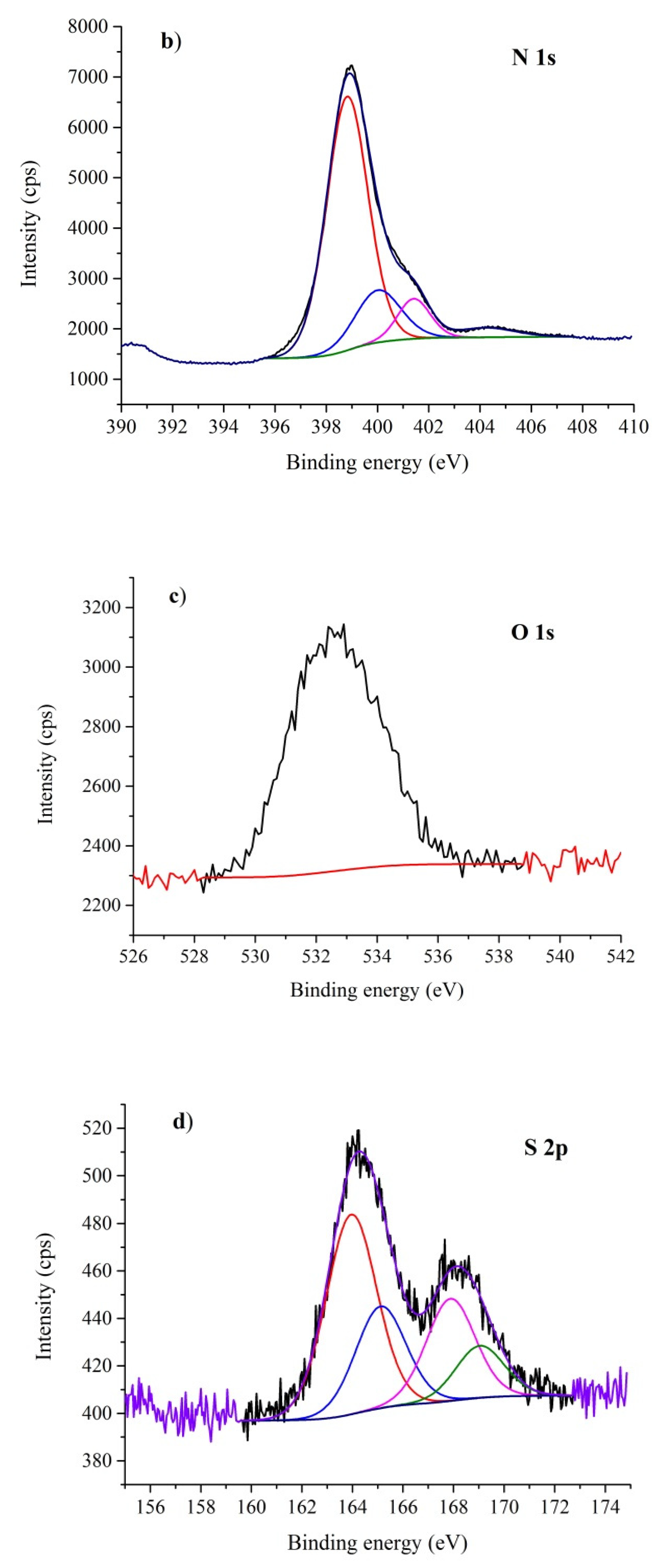 The superficial elemental analyses of the samples were carried out by means of an X-ray photoelectron spectrometer (XPS) ESCA 3400 (Kratos) with a base pressure in the analysis chamber of ~5.0 × 10−7 Pa. Electrons were excited with an Mg Kα radiation (hν = 1253.6 eV) generated at 12 kV and 10 mA. For all spectra, the Shirley background was subtracted. Peaks in all spectra ascribed to the sp2 hybridized nitrogen (C=N-C) were set to 398.8 eV as a charge correction.