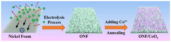 A nanostructured electrode composed of lamellar structured nickel oxide anchored CoOx nanoparticles on the NF substrate was fabricated, as illustrated in Figure 1. The commercial NF substrate was conducted by a facile electrolysis process to obtain an oxidized surface, confirmed by a color change of the foam from silvery-white to dark yellow. Lamellar nanostructures with improved specific surface areas were directly formed on the surface of NF substrate, providing more active sites for the further deposition of active materials. Furthermore, a tight contact between the oxidized nanostructures and the nether Ni layer can be achieved due to the direct oxidation on the foam surface. After immersing the foam in the cobalt acetate solution and then annealing treatment, the rough surfaces were covered by uniformly distributed nanoparticles.