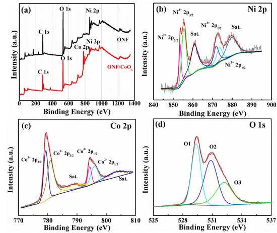 To further identify the chemical element composition and oxidation state of the electrode, XPS measurement was conducted. Figure 4a shows the overall XPS spectra of the ONF and ONF/CoOx electrode, demonstrating the existence of Ni element in the ONF and Ni and Co elements in the ONF/CoOx, in addition to the C and O element. The high-resolution XPS spectra of Ni 2p and Co 2p for the ONF/CoOx electrode are depicted in Figure 4b,c. The Ni 2p3/2 peak can be decomposed into two fitting peaks located at 853.5 and 855.4 eV, simultaneously accompanied by decomposed Ni 2p1/2 peaks at 871.8 and 873.4 eV (Figure 4b), demonstrating that element Ni exists in the lamellar structure in the form of Ni2+ and Ni3+ with a spin-orbit splitting of 18 and 18.3 eV. The binding energies at 860.7 and 879.5 eV are the two satellite peaks (identified as “Sat.” in Figure 4b,c), which are shake-up-type signals of Ni at the high binding energy [38,39,40]. The bands of Co 2p3/2 and Co 2p1/2 along with satellite peaks at 788.7 and 803.1 eV in Figure 4c can be deconvoluted into four peaks. The two peaks at 779.4 and 794.3 eV are indexed to Co3+, whereas two peaks at 780.9 and 795.9 eV are assigned to Co2+ [29]. The distance between Co 2p3/2 and Co 2p1/2 is 14.9 eV for Co3+, while 15 eV for Co2+, confirming the presence of cobalt oxide [41]. Figure 4d presents three oxygen peaks contributions of O 1S region of ONF/CoOx, which are marked as O1, O2 and O3, respectively. The peak of O1 at 529.4 eV is the typical metal–oxygen bonds, O2 at 531.1 eV comes from oxygen in OH- groups, and O3 at 532.2 eV is attributed to the mixed composition containing Co2+, Co3+, Ni2+ and Ni3+ ions [42].