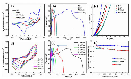 (a) CV curves of the NF, ONF, NF/CoOx, and ONF/CoOx at 10 mV/s within the potential window of 0–0.7 V; (b) GCD curves at 1 mA/cm2 and (c) Nyquist impedance spectra of four samples; (d) CV curves of the ONF/CoOx electrode at the scan rate ranged from 10 to 100 mV/s; (e) GCD curves of the ONF/CoOx electrode at the current density ranged from 1 to 10 mA/cm2; (f) capacitance retention for 3000 cycles of ONF, NF/CoOx and ONF/CoOx electrodes.
