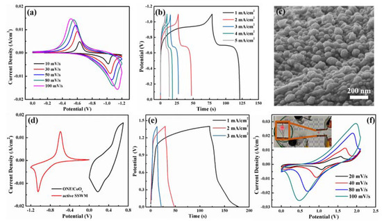 To ascertain the feasibility of the ONF/CoOx electrode in a supercapacitor, an ASC device using the ONF/CoOx as the positive electrode and an activated SSWM electrode as the negative electrode was assembled. Figure 6a,b shows CV curves at different scan rates and GCD curves at various current densities for the activated SSWM electrode, revealing a good capacitive performance and a working voltage window of −1.1 to 0 V. Figure 6c displays the SEM image of the surface morphology of the negative electrode, indicating the rough surface with a relatively high specific area. Figure 6d presents CV curves of ONF/CoOx and activated SSWM electrode tested at 10 mV/s. Figure 6e displays GCD curves of the device at the current densities changed from 1 to 3 mA/cm2, confirming good charge transfer and fast charging–discharging capabilities within a potential window of 1.4 V. Moreover, Figure 6f demonstrates the CV curves of the device with scan rates ranging from 20 to 100 mV/s. The symmetric and faradaic redox peaks in all curves reveal typical capacitive characteristics and excellent reaction reversibility.