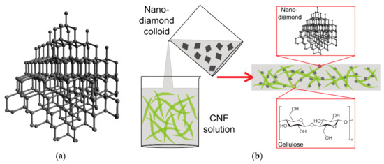 Scheme of a nanodiamond (a) and of the preparation and structure of nanocellulose/nanodiamond composites (b).