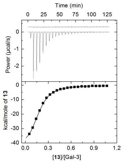 Figure 3. Representative titration of galectin-3 (Gal-3) (40.58 μM) with compound 13 (0.514 mM) in 20 mM phosphate buffer at pH 7.2 with 150 mM NaCl at 25 °C. The top panel shows the raw calorimetric data for 25 automatic injections, 5 µL each (1 µL for the first) of 13. The area under each peak represents the amount of heat released upon binding of the conjugate to the lectin. The smooth solid lines (bottom panel) represent the best fit of the experimental data to a model of n equal and independent sites.