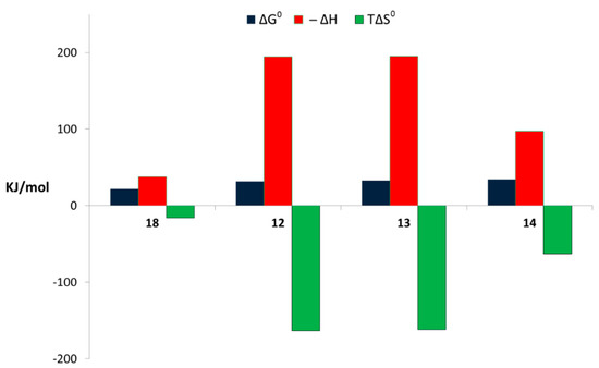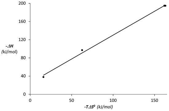 As can be seen in Table 2, the K values increase with the number of lactoside residues of the dendrimers, from monomer 18 to hexadecamer 14, due to a multivalent effect, with the binding affinities of tetramer 12, octamer 13, and hexadecamer 14 being −48-, −83-, and −156-fold higher than that for monomer 18. A deeper analysis revealed that binding enthalpy ΔH values rapidly decrease (become more favorable) when going from monomer 18 to dendrimer 12, which possesses four lactoside residues, where the ΔH value of 12 is −5 times lower than that for 18. However, moving from tetramer 12 to octamer 13, a small ΔΔH value of −0.17 kJ mol−1 is observed, which likely means that not all the lactoside moieties are involved in the binding. Furthermore, the increase in the multivalence to 16 lactoside residues led to an increase of 97.81 kJ mol−1 (less favorable) of the enthalpy binding. Nevertheless, these changes in enthalpy binding with an increase in the number of lactoside residues are counterbalanced by changes in unfavorable entropic contributions. For example, a less favorable enthalpy binding for 16-mer 14, compared to 4-mer 12 and 8-mer 13, is compensated with a less unfavorable entropic term than that for the compounds. Thus, a strong enthalpy–entropy compensation behavior is observed with a slope slightly greater than unity (Figure 5), which is typically found in carbohydrate–lectin binding interactions [57,58]. Although the origin of this phenomenon remains unclear, such compensatory behavior has been attributed to solvent reorganization upon ligand binding, suggesting that the Fc-Lac conjugates follow a similar binding mechanism. The n values are lower than unity for all multivalent glycoconjugates (Table 2), as expected for the interactions of multivalent carbohydrates with oligomeric lectins [59]. Such behavior suggests an increase in the cross-linking between the glycoconjugates and Gal-3, with an increase of the number in lactoside residues. However, while Fc-Lac dendrimers 12 and 13 showed n values below and relatively close to the theoretically expected values for a tetramer (1/2 = 0.25) and an octamer (1/8 = 0.125), Fc-Lac 16-mer 14 showed a value larger than that theoretically expected (1/16 = 0.063), which indicates that, for this compound, not all of the lactoside residues participate in the binding, as noted above.