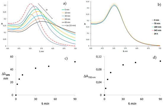 Figure 6. (a) UV–visible spectra of AuNP@Fc-Lac (2 nM) in a phosphate buffer of 10 mM, pH 7.2 with 20 mM NaCl in the presence of Gal-3 (10 µM) recorded at different times after addition of the lectin along with the UV–visible spectrum of this mixture after the addition of an aqueous saturated D-Lactose solution (dashed blue). (b) UV–visible spectra of AuNP@Fc-Lac (2 nM) in phosphate buffer 10 mM, pH 7.2, in the presence of BSA recorded at different times. Variation of ΔλSPR (c) and absorbance at 700 nm (d) over time.