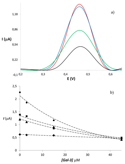 Electrochemical measurements were carried out in sonicated, nitrogen-purged aqueous (Milli-Q 18.2 MΩ cm) solution with a micro-Autolab type III connected to a personal computer running Eco Chimie B. V. GPES 4.9 software. The electrodes were carefully cleaned before each experiment. The glassy carbon disk working electrode (Ø 2 mm, effective area 0.038 ± 0.006 cm2) was immersed in a 0.1 M HNO3 solution for 5 min and polished with a basic Al2O3 water slurry. The platinum sheet counter electrode (6 × 4 mm, effective area 0.410 ± 0.003 cm2) was immersed in a 50% v/v H2SO4 solution for 5 min. Both electrodes were then sonicated in a 1:1:1 H2O/MeOH/CH3CN mixture for 5 min prior to use. The effective area of the electrodes was determined as previously reported [39]. An Ag/AgCl (3 M KCl) electrode was used as a reference. Solutions of conjugate 18 (Figure 1) and dendrimers 1214 (50 µM for 18, 25 µM for 12, 12.5 µM for 13 and 6.25 µM for 14) and increasing amounts of Gal-3 varying from 0 to 45 µM were prepared in 10 mM phosphate buffer at pH 7.2 with 20 mM NaCl and incubated for 10 min at room temperature. Before each measurement with AuNP@Fc-Lac, the glassy carbon electrode was modified by incubation in solutions of AuNP@Fc-Lac (20 nM) in 10 mM phosphate buffer at pH 7.2 with 20 mM NaCl for 1 h at room temperature and then washed with plenty of H2O. After that, it was allowed to equilibrate for 10 min in solutions of different concentrations of Gal-3 ranging from 0 to 500 nM. Nitrogen was bubbled through the solutions for 3 min before each measurement. Differential pulse voltammetry experiments were measured with a scan rate of 5 mVs−1, a step potential of 20 mV, a modulation amplitude of 50 mV, a modulation time of 0.05 s, and an interval time of 2 s between 0 and 1 V for AuNP@Fc-Lac, 0 and 0.8 V for dendrimers 1214, and 0 and 0.7 for 18.