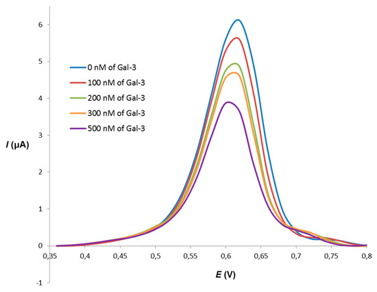 Figure 8. Differential pulse voltammogram for AuNP@Fc-Lac-modified glassy carbon electrode in the presence of increasing amounts of Gal-3 (0 nM, blue; 100 nM, red; 200 nM, green; 300 nM, orange; 500 nM, purple) in 10 mM phosphate buffer at pH 7.2 with 20 mM NaCl as the supporting electrolyte.