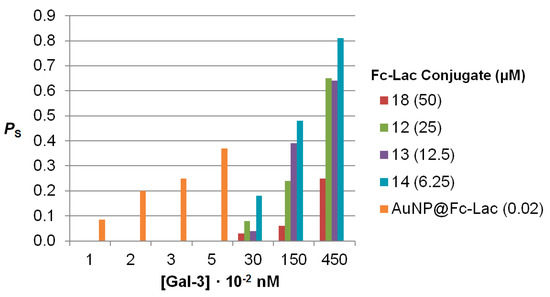 Figure 9. Sensitivity parameters (Ps) for ferrocene–lactose conjugates 1214, 18, and AuNP@Fc-Lac with increasing concentrations of Gal-3.