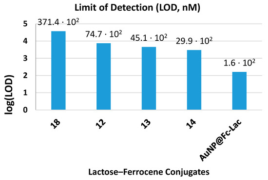 Figure 10. Limit of detection (LOD) for ferrocene–lactose conjugates 1214, 18, and AuNP@Fc-Lac (logarithmic scale). The LOD (nM) value for each conjugate is shown over the respective bar.