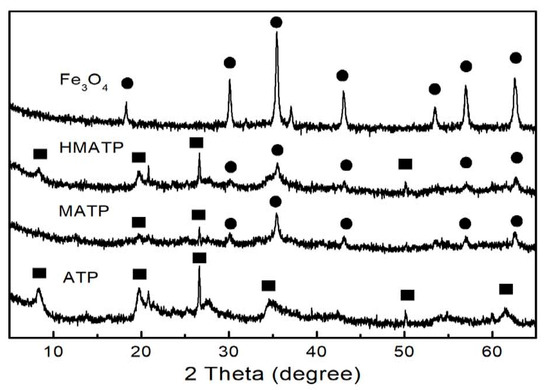 The XRD patterns of Fe3O4, ATP, MATP and HMATP are depicted in Figure 4. It can be observed that some diffraction peaks are obtained at 2θ = 8.3°, 13.6°, 19.7° and 27.28° in the ATP curve. Xue et al. showed that the above peaks represent the (110), (200), (040) and (400) planes of the attapulgite [39]. At the same time, the typical peaks of pure Fe3O4 are also observed and consistent with the reference [40]. In curves of MATP and HMATP, the characteristic diffraction peaks of magnetite Fe3O4 and ATP are present in both MATP and HMATP, indicating that Fe3O4 nanoparticles have been coated onto the surface of ATP. It should be pointed out that HA cannot be distinguished by XRD, because it does not diffract.