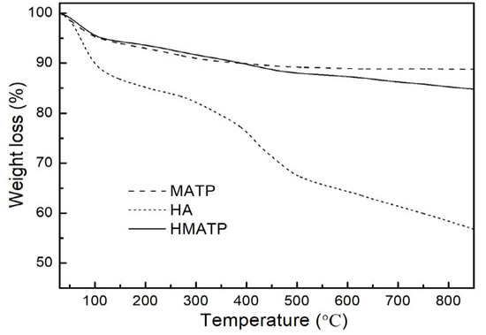 Figure 6 displays the thermogravimetric profiles of HA, MATP and HMATP. As seen from Figure 6, HA is not thermally stable when the temperature was increased, and about 32% of the sample decomposes before 500 °C. In addition, MATP has a higher thermal stability than HA. After HA coating, percentage weight loss is more in HMATP as compared to MATP, and about 8% of HA has been loaded onto MATP.